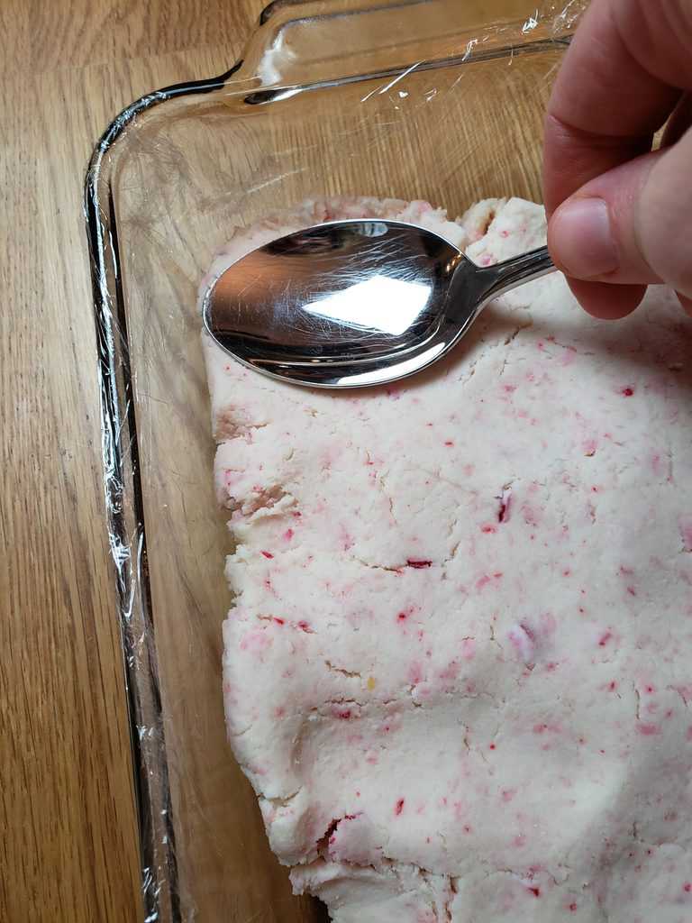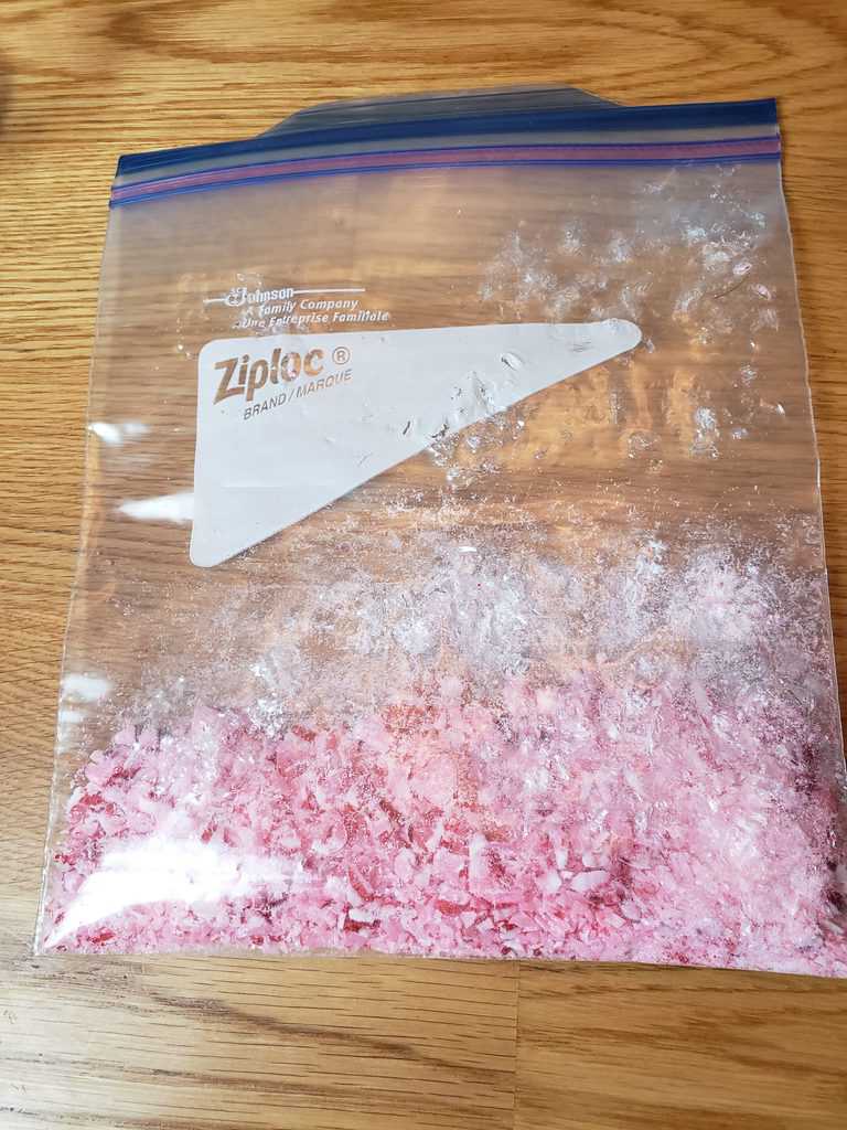 Crush the candies. I put them in a Ziplock bag and gently hit them with the side of a hammer. It doesn’t take a whole lot of banging or you will have a mess!