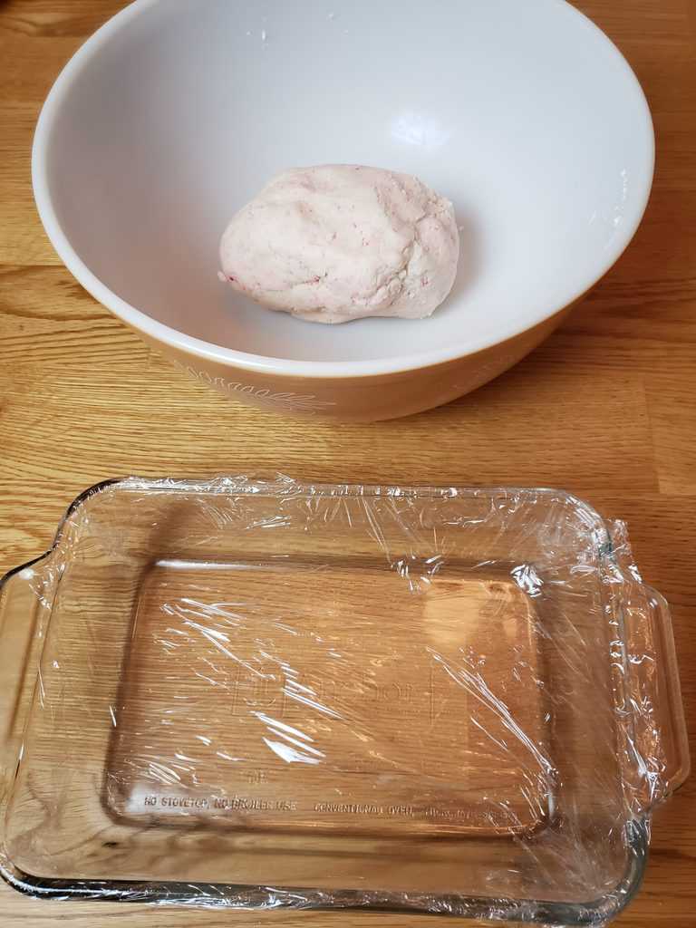 Line a 6x9 or similar size pan with plastic wrap. Square or rectangular is best for cutting the fudge into squares. The plastic wrap will make it easy to get the fudge out after it chills.