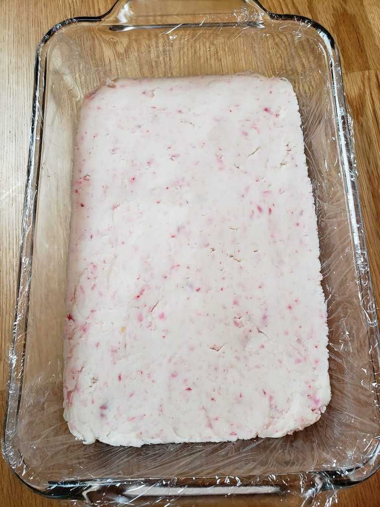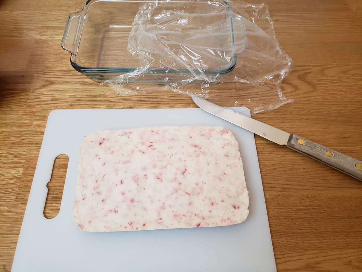 Line a 6×9 or similar size pan with plastic wrap. Square or rectangular is best for cutting the fudge into squares. The plastic wrap will make it easy to get the fudge out after it chills.