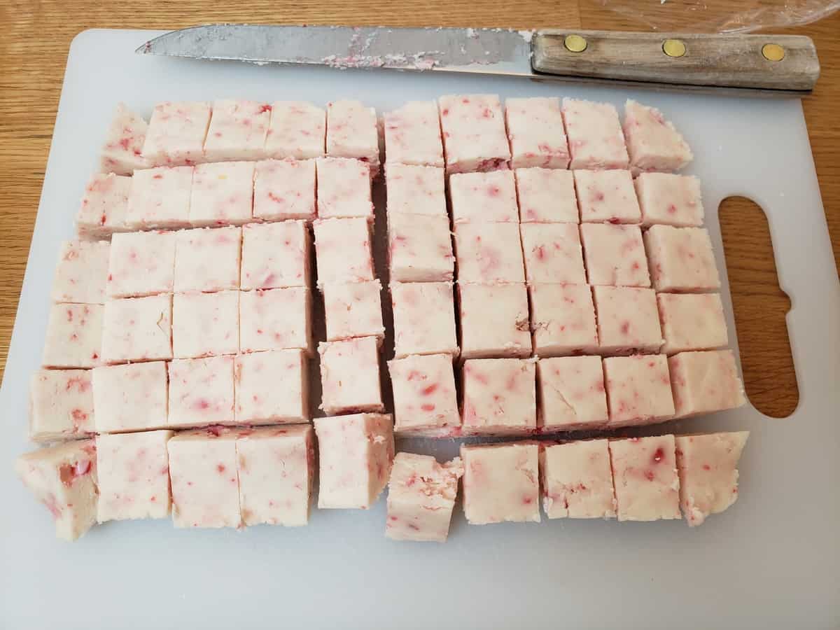 Gently remove fudge by picking up by edges of the plastic wrap and setting onto a cutting board to cut into squares.