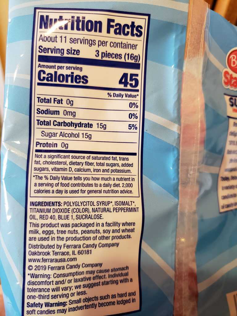 6Amount Per Serving Calories 47Total Fat 3gSaturated Fat 2gTrans Fat 0gUnsaturated Fat 1gCholesterol 12mgSodium 48mgCarbohydrates 6gNet Carbohydrates .75gFiber 0gSugar 0gSugar Alcohols 5.25gProtein 1g