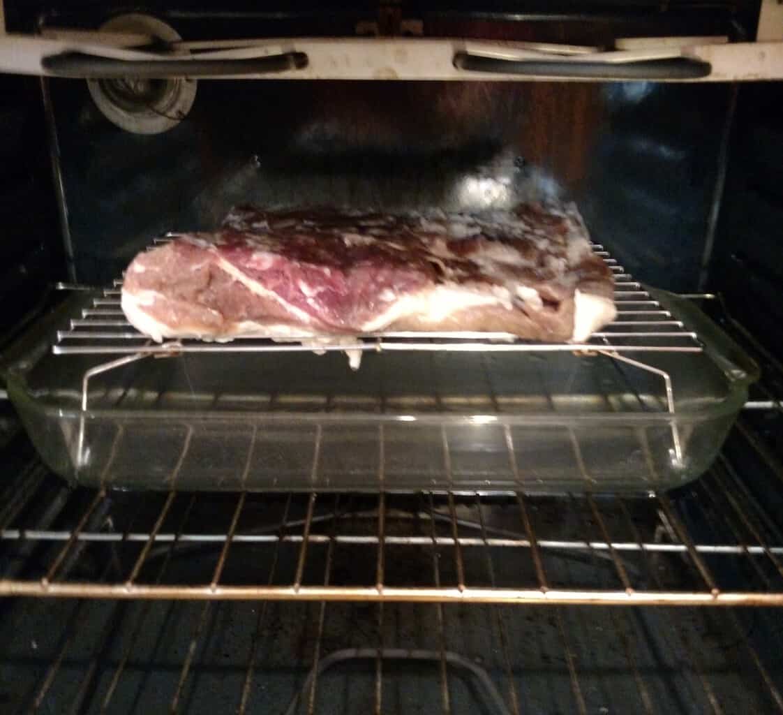 Put the pork belly on a wire rack on top of a baking sheet and cook in a preheated 200* oven for about 4.5 hours or until the internal temperature of the pork belly registers 150 degrees.