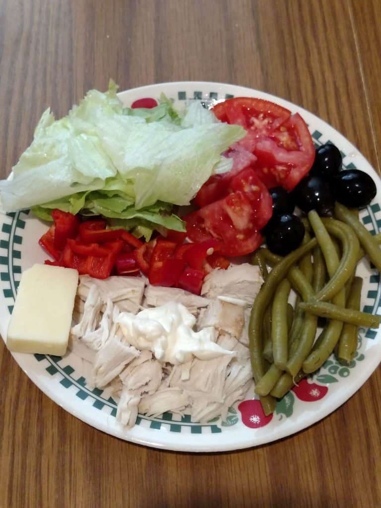 Bed of romaine lettuce, bell pepper, tuna with mayonnaise, shredded cheddar cheese, 2 hard boiled eggs quartered