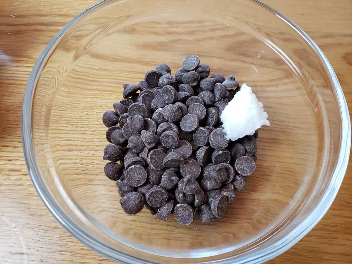 Melt the chocolate chips and coconut oil in a double boiler on stove or microwave until melted. I used the microwave and did 30 seconds, stirred then another 20 seconds.