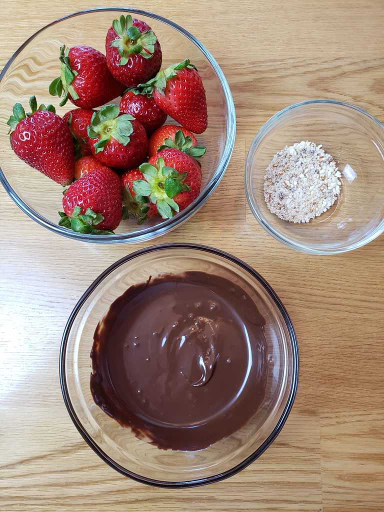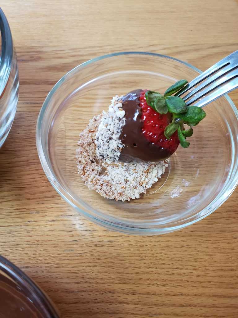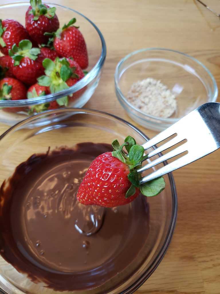 Dip into the crushed almonds or sprinkle them over the covered berries, whichever you prefer. Sprinkling will give you a lighter coating of almonds.