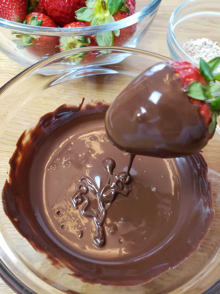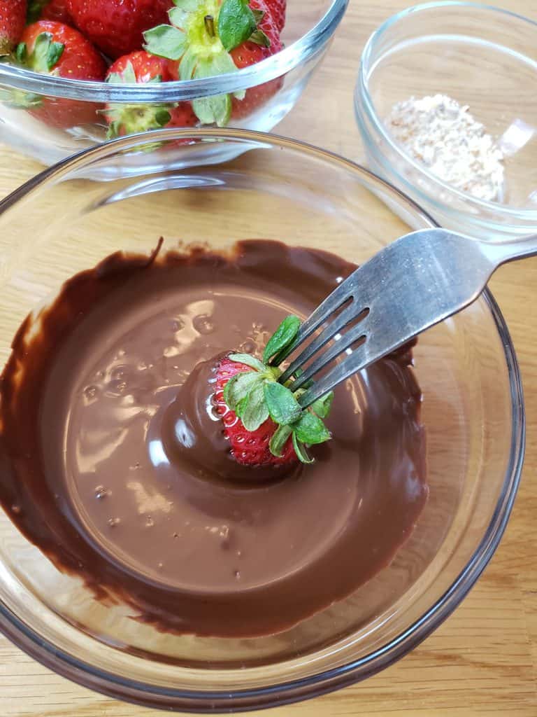 Use forks or toothpicks to dip and swirl the berries through the chocolate, letting the excess drip off.