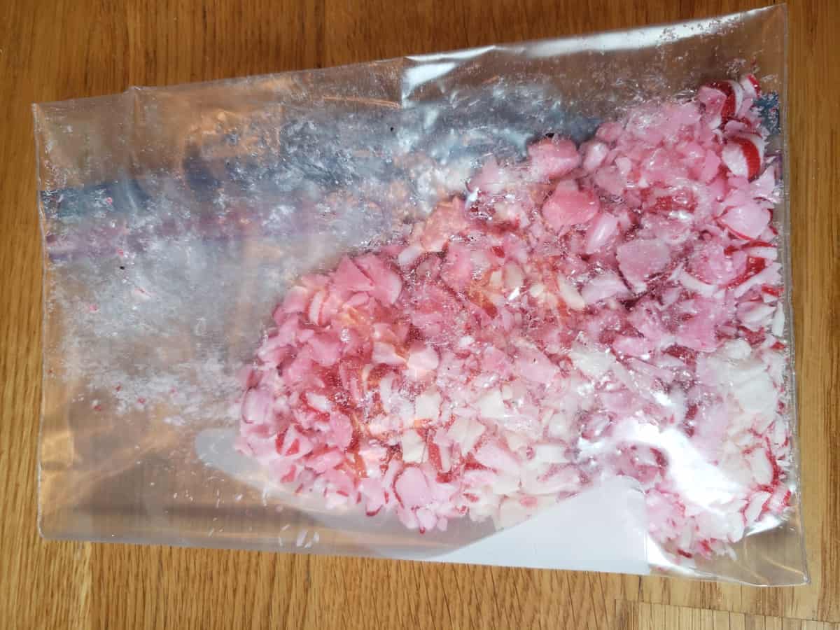 Crush the candies. I put them in a Ziplock bag and gently hit them with the side of a hammer. It doesn’t take a whole lot of banging or you will have a mess!