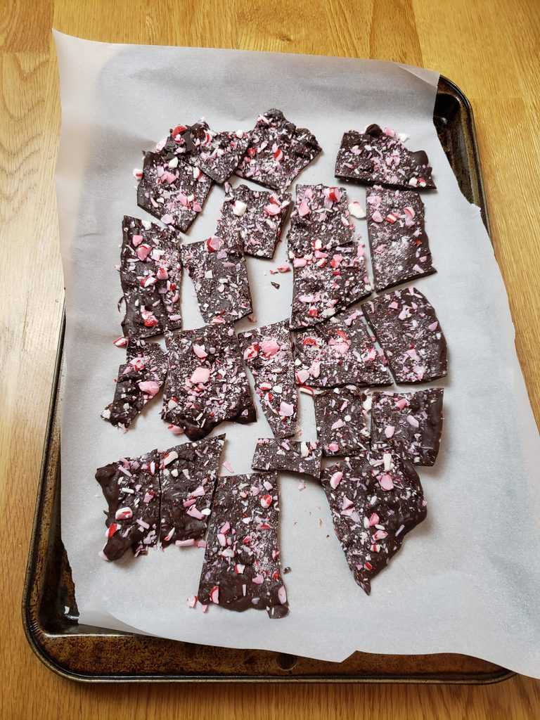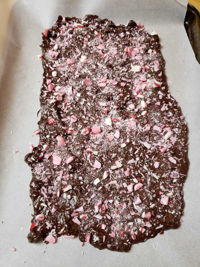 sheet. - Sprinkle the remaining crushed candies over the bark mixture.
